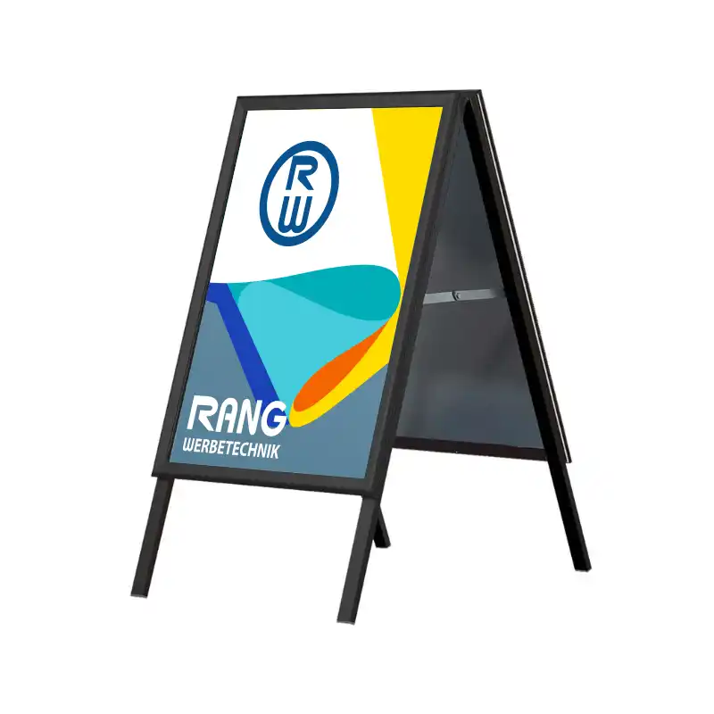 Ist der Kundenstopper beidseitig nutzbar?: Ja, beide Seiten haben Klapprahmen. Du kannst zwei Plakate gleichzeitig präsentieren.