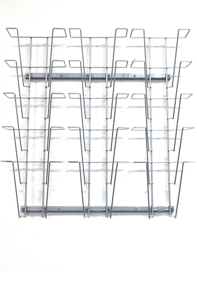 Prospekthalter aus Draht. Polyesterlakiert in RAL9006 Silber. Für 15x A4 Prospekte. die Tiefe beträgt 2 cm je Fach. Für Wandmontage.