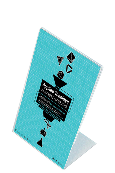 Menühalter L-Form aus transparentem Acryl. Schräg freistehend.