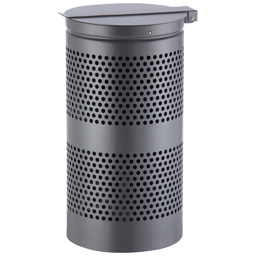 Abfallbehälter mit Deckel in kräftige Ausführung, aus grau pulverlakiertem Stahl hergestellt. Der Abfallbehälter kann mit Beuteln verwendet werden, die leicht an den Behälter befestigt werden können. Der Behälter fasst 38 Liter. Für Montage an Wand, auf Fliesen und Beton. Für den Außenbereich geeignet.