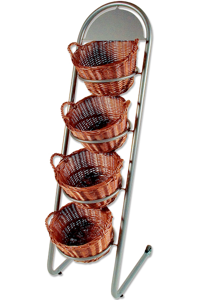 Verkaufsregal Backwaren mit 4 Körben. Ständer aus 32 mm phosphatiertem und polyesterlackiertem Stahlrohr (RAL 9006) produziert. Wird mit 4 runden Körben und 2 Rollen geliefert. Wird montiert geliefert. Korb Ø 35 cm, Höhe 20 cm.